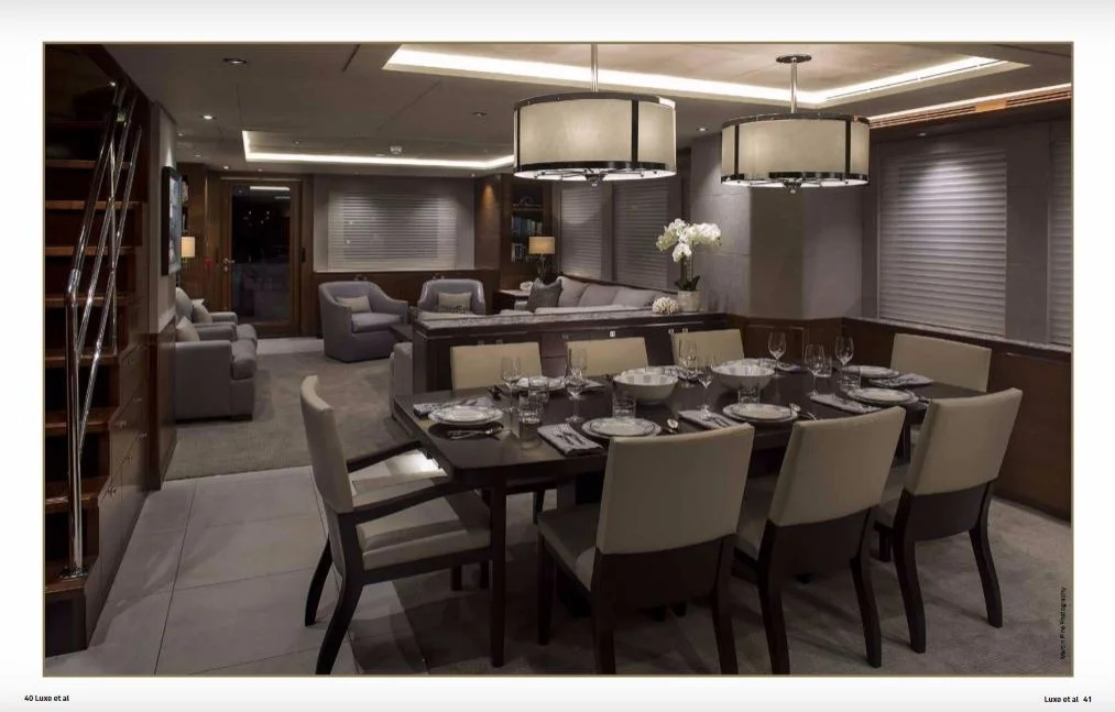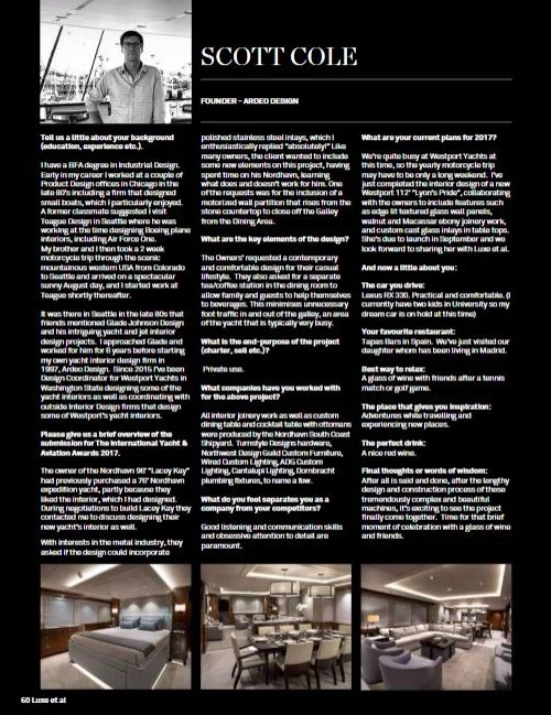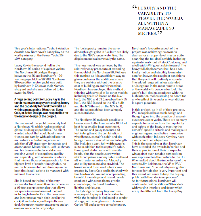 “...A huge selling point for the Lacey Kay is the fact it maintains megayacht styling, luxury and the capability to travel the world, all within a manageable 30 meters. Scott Cole, of Ardeo Design, was responsible for the interior design of the project." - Page 44